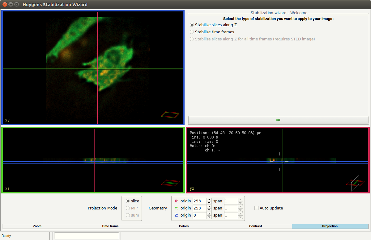 The Object Stabilizer can measure and correct for cell motion, thermal drift, shaking, and other types of movement (x-y-z translation and axial rotation). Both the measurement and subsequent stabilization are done in 3D and at sub-pixel level. The Stabilizer not only stabilizes 2D or 3D time series, but it also allows the alignment of slices within a 3D stack.