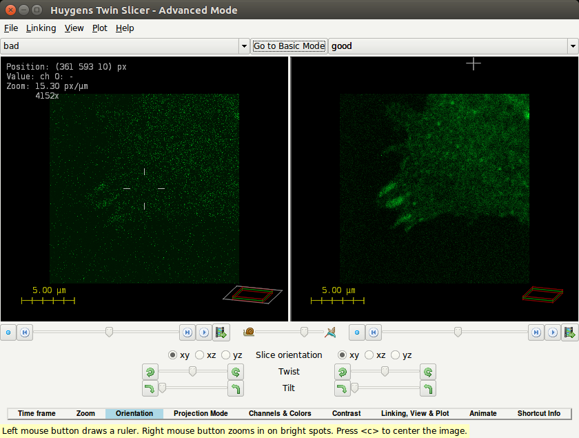 The Twin Slicer allows you to synchronize views of two images, measure distances, plot line profiles, etc. In Basic Mode, image comparison is intuitive and easy, while the Advanced Mode gives the user the freedom to rotate the cutting plane to any arbitrary orientation, link (synchronize) or unlink viewing parameters between the two images, and more.
